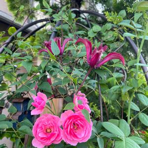 クレマチスHFヤングが綺麗に咲いています。結局ロイヤルサンセットとコラボし咲き乱れるの図❣️の夢は叶いませんでした😭咲く時期が微妙にズレているんですよね〜💦