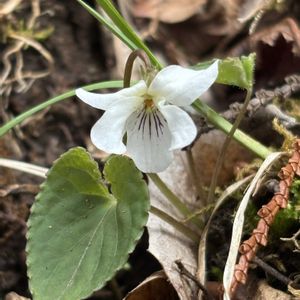 シコクスミレ(四国菫)スミレ科スミレ属 別名、ハコネスミレ 富士山麓にシコクスミレが咲いてます。 3株確認できました。 葉は長さ2~4㎝の心形、先が尖り、波状鋸歯縁、葉脈が深い。 葉の形と脈の湾曲と深さに特徴があり、葉だけでも見分けやすい。 花は、直径約1.5㎝、白色。 花弁の裏も白色で、唇弁の紫色のすじは濃くはっきりしている。 距は非常に短く、ほとんど後ろに突き出ない。 萼片はしだいに反り返り、付属体に切れ込みがある。 側弁の基部は有毛と無毛がある 🏷 白い貴婦人✨ 🏷 白い水曜日♡