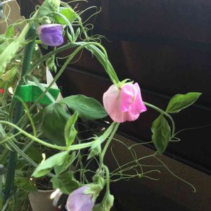 切り花用スイートピーの花が咲いてきました。 ピンクと紫色のようです。 もうすぐ亡き夫の命日なので、仏壇に飾れると嬉しいですが。