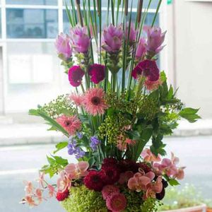 クレマチスとタイツリソウがふわふわと揺れて可愛い、開店祝いのアレンジメント。