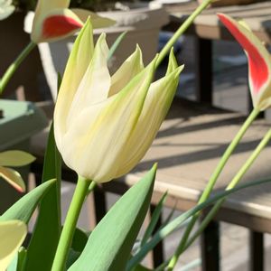 チューリップ ホワイトトライアンフェター✨🤍 二色咲きの原種系チューリップに続いて咲き出しました🥰💞 ユリ咲きチューリップ🤍🌷