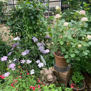 雨前に フェンス右側 スパニッシュビューティーは そろそろ満開… しかーし😊やはりクリスティアーナは 咲いてこない💧 ヴァイオットも全然です。 1週間雨だし☔️グチャグチャになりそうだから(><) picを