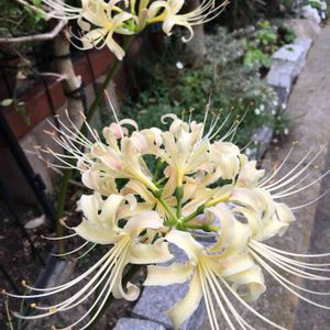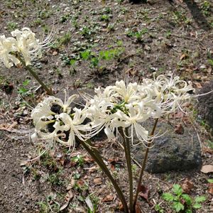我が家の三か所目の白いヒガンバナ 植えた覚えのない場所で健気に咲いています。