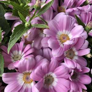 お店の店頭で見つけたサイネリア 同じピンクでも雰囲気が違ってとてもかわいい 中心の白が🤍お花の印象を変えている.🩷🤍💖 4️⃣ラナンキュラスの二番花 お花も小さく花弁が少なかったのですが、花芯がとてもかわいい 5️⃣やっとお花が咲いたパンジーお名前があったのですが……