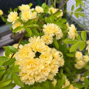 3年目の鉢植えモッコウバラ😄 立派に成長して、もりもり満開です💓 ベランダが明るくなった感じ😄 いつまでも眺めていたい💓💓