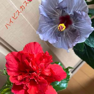 寒くて雨が降ってるのに、外で元気に咲いてる(◍•ᴗ•◍)❤︎ 八重咲きハイビスカス メドューサと、紫のケイトさん💟 流石に記念写真のあと部屋の中に避難しました꒰ ︠ु௰•꒱ु❤