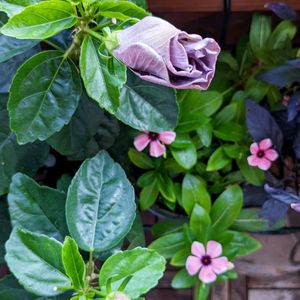 ハイビスカスとビンカ 夏のお花コラボ 早く雨病んでほしい🥲
