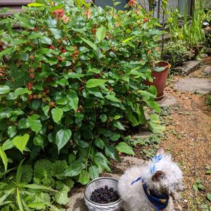 去年の📸です ベルちゃん15才🌈🐩桑の実収穫始めの頃〜 赤い実が黒ずんだ時に収穫し!!冷凍庫に入れまとめてからジャムを作る👍😄 こんな小さな木から沢山のジャムが〜 皆さんにお裾分けし美味で喜ばれました✌️🥰🎶