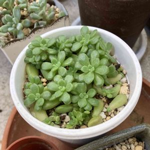 だるま姫秀麗×スプリングワンダー いわゆる小梅 親株です。なんとか猛暑に耐えてくれた🥲 春に挿し穂と葉挿しのためにカットしてちょっぴり土の入れ替えして購入時のビニールポットにリリースしたのでもうちょっとまともなポットに入れてあげたい 底穴から根が出てきてるし…