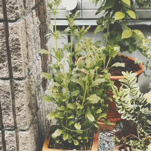 玄関向かって左側のせまい庭のお花たちです 咲いてるお花も少なくなってきて、グリーン多めの寄せ植えが増えてきたから、ますますジャングル化してます 今日は、うどん粉まみれ、ハダニだらけのミニバラの花を諦めて、ハゲ散らかして、薬を撒きました