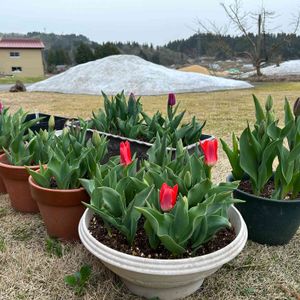 今のお庭17時頃です🪴 🌷が咲き始めました(60球) 奥に残雪1mは有ります😄