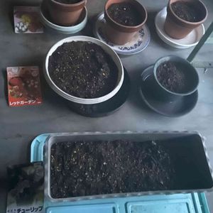 空いている鉢をかき集め植え付け完了! かまぼこ形の車庫2階です(窓際) 芽🌱が幾つか出てます💕 主人に🤫です^ ^