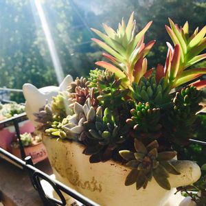 今朝は、朝日が綺麗に照らしていた。 三月に寄せ植え教室で植えた子達も、とっても元気! この寄せ植えは、自然のままにしておこうかな🤔