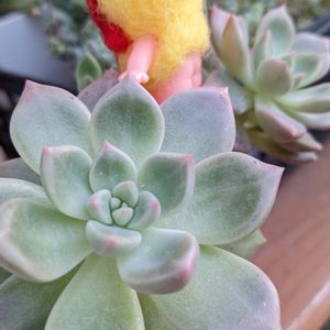 葉先がほんのりピンクで 可愛い子がいました😃 エケベリア属エピアン グラプトベリアのアバンギャルドと 一緒にもらったのでいつも どっちだっけ🤔❓と考えてしまう😅 チキンキュピちゃんのキュートなオチリで 🏷オケツの日 初参加させてください🤗
