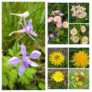 ハルジオンが至る所で咲いています✨園芸植物として渡来したそうで、特別感のある綺麗な濃いピンク色の花を見ると納得ですね💗 畑や庭では雑草扱いの黄色い花達も… 左上オオジシバリ 右上セイヨウタンポポ 左下コウゾリナ 右下オニタビラコ それぞれ、輝くような黄色でとても綺麗です✨✨