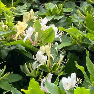 甘い香りが魅力のスイカズラとハニーサックル🎶 香りを漂わせて存在を知らせてくれるスイカズラは、白からクリーム色に変わる花色も素敵です✨🤍🧡 そして我が家のハニーサックルも…💗🧡