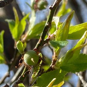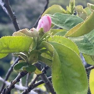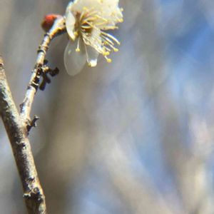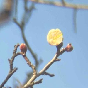 小さな小梅が実る梅の木です。 一輪だけあわてんぼうさん