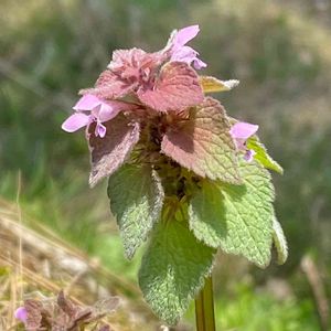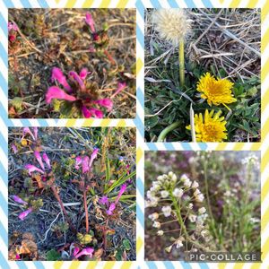 ☆お散歩☆ 久々に農道を歩いて出会えた雑草 ↖️ホトケノザ、他より色が鮮やか ↙️ホトケノザ ↗️タンポポとわた毛 ↘️ペンペンソウ