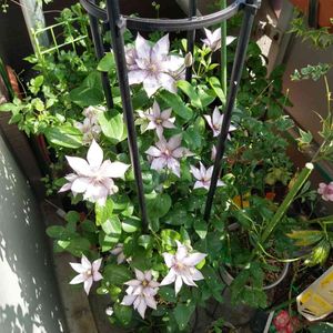 こんばんは! 今日はすっかり良いお天気になりましたねぇ〜仕事してるのが勿体ないくらいでしたね🤭 今朝は、お庭のお掃除と薔薇のお手入れをするのが精一杯でした😅 慌しい中、ついでにクレマチスのうどんこ病になってる所もカット✂️ ちょっとはスッキリした!! と思って全体を見渡したら、 居ました‼️✨🤩 春にやはりうどんこ病になってしまい殆ど見れなかったシリンドリカスウェーディッシュベルズ❣️ 淡いブルーでヒラヒラ💕かなりお気に入りの子なんです😍 もう、枯れてしまったのかと心配してました💦 他の子のつるとごちゃごちゃで何が何やらで分からなくなってました😂 お花を見れて良かったです🥰 他のクレマチスも再び咲きました❣️