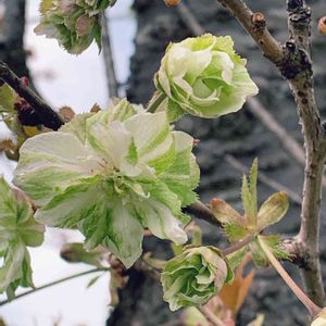 ギョイコウ(御衣黄) やはり栽培品種の八重桜で、こちらは淡緑色の花弁で開花時には目立たないが次第に中心部から赤みが増して、散る頃にはかなり赤くなる。
