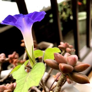 季節外れの朝顔。 多肉ちゃん達の間から芽を出して咲きました(^^)