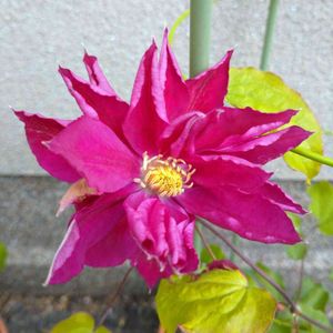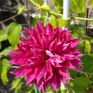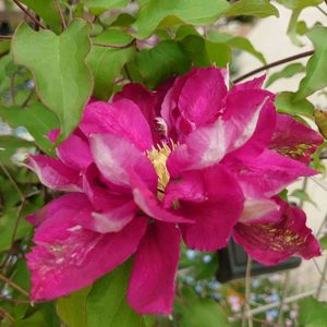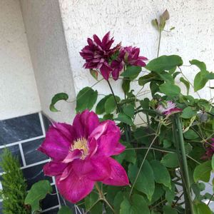 こんばんは😊 クレマチスレッドスターと昨年教えて頂き(タグが風に飛ばされてしまった)今年も見事に咲いています💕 レッドスターの大好きなところは、緑の葉っぱにもこの強烈なピンクが入って斑入りが出ること‼️ 物凄く綺麗なんです💕 咲く前にこれはお花か葉っぱかどっちだろうって、翌朝お花と一緒の斑入り葉っぱも誕生していると嬉しさ倍増‼️ 緑に濃いピンクってなんてチャーミングな組み合わせなんだろう😍😍