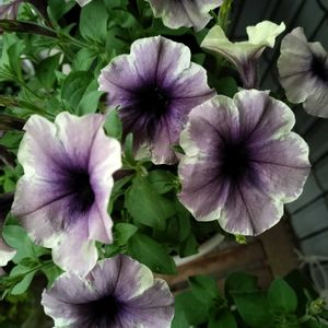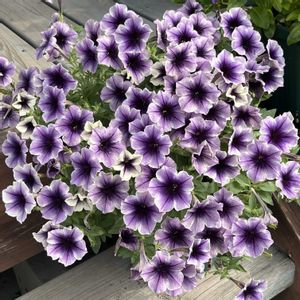 ペチュニア モンローウォーク ベールモーブシルバー🩶💜🩶💜 今までで1番たくさん咲きました🙌 好きなお花ですが毎年上手く育てられなくて😣 これも皆さんと比べたらお花少ないですが、私的には上出来ᐠ(∗ᵔᗜᵔ∗)ᐟ💓 私のガーデニングはL字のウッドデッキとその周辺がメインです。 ↘︎ L字の凹みはお花でいっぱい💕💕