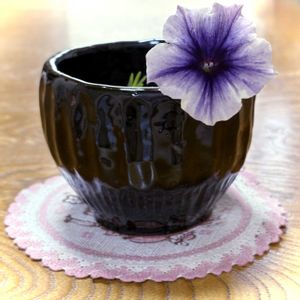 陶芸教室の初めて作品は、これ☝️😆 いびつな黒椀(しのぎと面取り技法) ペチュニアが枯れ枯れになりながら咲いてて〜😵 どうしてあげたら良いやら✂️🤣💦