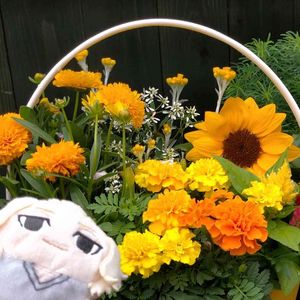 行きつけの花屋さんでかわいい寄植えを発見! オレンジに黄色とビタミンカラーで元気いっぱいな雰囲気です🤩 我が家の妖精くんにピッタリ✨