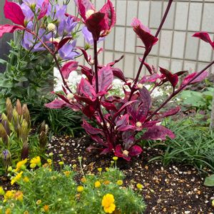 🍀勝手に生えてるシリーズ その⑥ 何に紛れていたのでしょう? これも植えた覚えがない葉っぱ Google lensで調べると… 🔎アカバセンニチコウと出ました 葉の色が綺麗✨ 庭のアクセントになるのでこのまま育てる事にしました😄