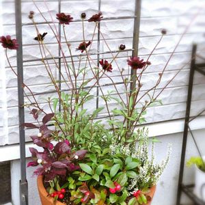 調子にのって 寄せ植え(*^ω^*) 寄せ植えが苦手で、このサイズは殆ど作りませ~ん😅 混みあうと想定して隙間を空けてます(o^^o) ↓品種などの詳細は下に。一年草は🌱マークです😊 上 : ネコノヒゲ 赤葉センニチコウ🌱(霜で枯れる) コウシュンカズラ(ミリオンキッス) 中間: ハマギク ビデンス 手前: ガーデンシクラメン ダスティーミラー(白妙菊) ケイトウ(小人の森の音楽会)🌱 ミントブッシュ(斑入りのミラクル スーパー)