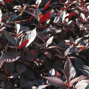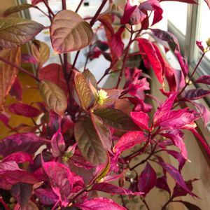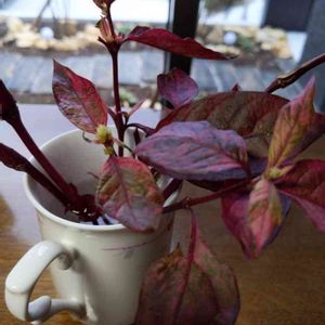 この赤い葉に白い小さな花が咲いています。名前を教えてください。