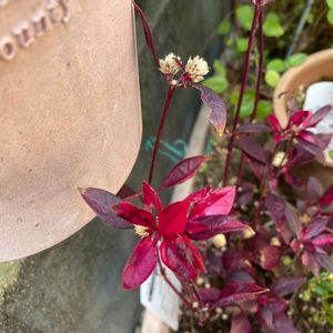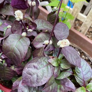表は渋い紫で、葉っぱの裏は赤色です。 小さなお花が咲きました。