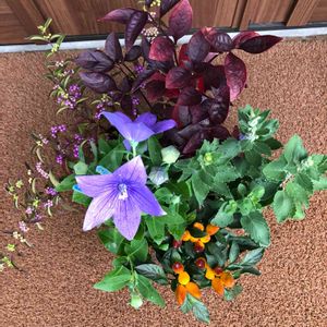 🍂秋の寄せ植え🍃 5種類並べてみましたが、なんかしっくり来ないのです😢 🧡の唐辛子? 💜桔梗? どなたか良きアドバイスをお願いします😊
