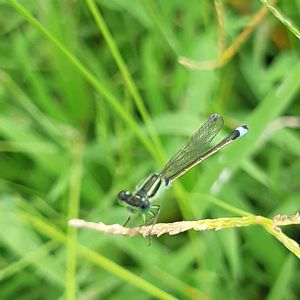 イトトンボ スマホ画面では、どこにいるのかさえ判別できない小さなトンボ 普通ならとっとと、どこかにいってしまうシチュエーションなのにずっと付き合ってくれた、 👕💦(汗かき) ウォーキング