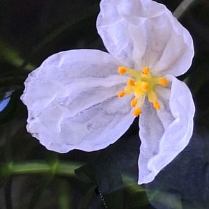 🤍うちの食いしん坊金魚 すぐに水草を食べちゃうから ••••• 裏庭のメダカちゃんちで すくすく育っている水草を採取しに行くと水盤の中でこんなお花が咲いていました もしこれが ˚*.꒰ オオカナダモ ꒱.*˚だったら 雌雄異株なんだけど 日本では雄株しか見ることが出来ないそうです