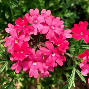バーベナ 花手鞠 花壇前方で四方に伸び、薄桃色🌸濃桃色が輪になって踊っているよう。