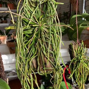 キロスキスタ・ヴィリデフラバ 花芽がびゅんびゅん伸びてます。それも複数😲。 蕾も膨らんでます。 ウスネオイデスのカーテンの陰で、順調に育っています😃。 根っ子しかないラン、無葉ランの仲間ですが、面白くて好きです😊。