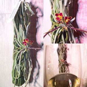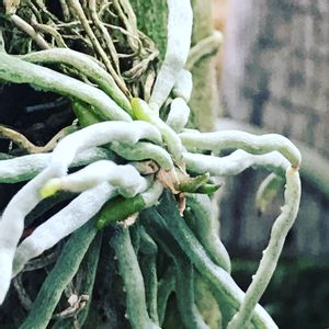 葉っぱをつけない無葉蘭の仲間の キロスキスタ・ウスネオイデス です。 根っこに葉緑素を持ち、光合成をするため葉が要らない、面白い洋蘭です😊。 乾燥に弱いと聞いたので、チランジア・ウスネオイデスの側に吊るしていたところ、しっかりと活着しました😃。