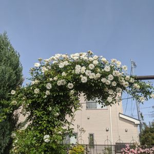 🌹ピエール ドゥ ロンサール🌹 鉢植えから地植えにして2年目の開花✨ ようやく満開です💕 来週は天気の悪い日が続きそうなので見納めかな。 今年は初めてアーチに誘引🌿 来年はもっと上の方まで伸びて咲いてくれるといいな😌