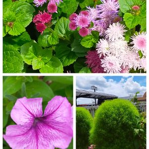 駅前の花壇より ピンク系のアゲラタム ピンクのサフィニアが可愛らしく咲いています💞 花が少ない緑の庭の我が家、来夏はカラフルな花を植えようと思いました💗 コキアは丈80センチと巨大でした💚