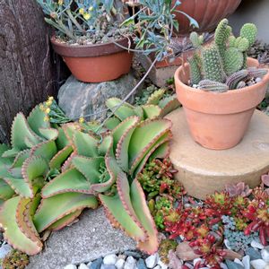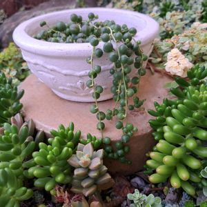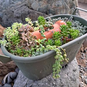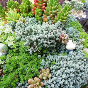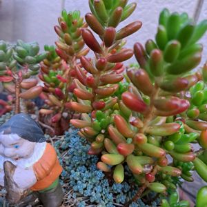 おはようございます。 4月初旬に作った寄せ植えです。😆 先月リメ鉢を沢山作ってた時に作ったんですが、投稿し忘れて今日になりました。😅 粘土をクッキー型で抜いた人型なんですが、水をかけてはいけない事に今更ですが、気がつきました。 溶けちゃうんです。 【当たり前😅】 左から紅稚児、セダム、玉つづり、紅葉祭り虹の玉、アーモンドネックレス、真ん中がアズールブルーです。