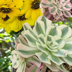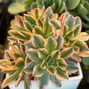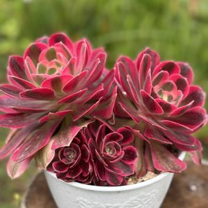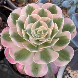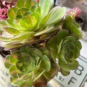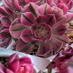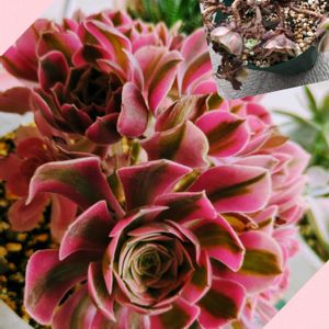 アエオニウム ピンクウィッチ 中斑の子🤗 奥のピンクの ピンクウィッチと 同じ株です 4picこんな感じ😂 中斑さんに ほとんどの栄養いってるよね 🤔💬 今はカット✂️出来ないしな 無事に夏越し出来たら カットしよ😊