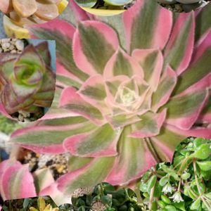 アエオニウム ピンクウィッチ中斑 ピンクウィッチ群生株から 伸びている 中斑の子です☺️💓 やたら 大きくなって カット✂️しなきゃいけないかな💬 同じ株からなので 価値があるんだけどなぁ、、 もう重たそうで😂