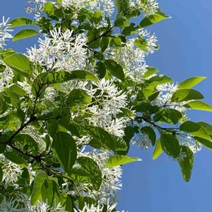 ヒトツバタゴ 磐之姫陵から南の水上池へ ここにも真っ白のお花が… 大きな木ではありませんが、青空にこの花は本当に美しい✨ モクセイ科ヒトツバタゴ属