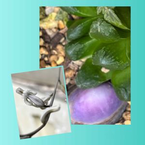 冬越ししてくれたハオルチア🟢 長く延びた先に不思議なお花が咲きました。👀💦🤔まるで、すず製みたいな笑😆 ダメ元で車庫で様子見てたらなんとか生き延びてくれましたが、お花まで。🙏🙇♀️💕感謝でしたー。 手前の紫💟は、砂浜で拾った貝、なんか鮮やかになってる☺️