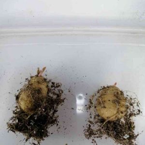 タリナム・カフルム 去年実生した苗🌱 中々芽が出ないので、腐ったのかとハラハラしていたら無事に芽が出た😁 急いで植え替えをしようと、掘り起こしてみたらしっかり芋できてました😊