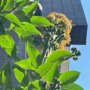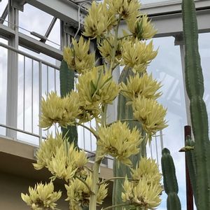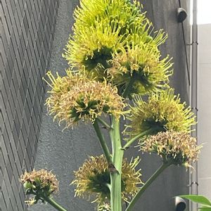 ✿リュウゼツラン (竜舌蘭) 中南米原 多肉植物 数十年一度だけ株元の中央から幹のような花茎がたちあがり 花茎から伸びた枝先に小さな花を沢山付ける。 下から徐々に咲く💛 開花後は枯れて倒れる 株元から外側に伸びた葉の縁にギザギザがありその葉の形から「竜舌」の名が付いた ①枝先に満開のお花💛 ②12mほど気持ち良く伸びた全体の姿 ③下から8割位の高さまで咲いた様子 ④一番上の蕾と咲き始めの花 ⑤株元の中央から幹のような花茎が立ち上がり、伸びる 話題になってるリュウゼツランを見てきました😁 7/18 横浜上永谷撮📱