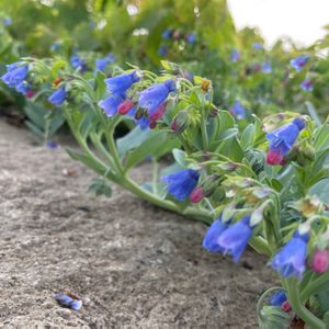 色合いが可愛らしいピンク水色🌸💙系の鉢植えの小花です。球根かしら?花の形はベル型🔔なのかしら?