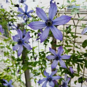 クレマチス〜蘢口 ろうぐち 鉢の置き場所を変えたら大きな花が付くようになり嬉しいです。 添木を置いただけの自然誘引。。。